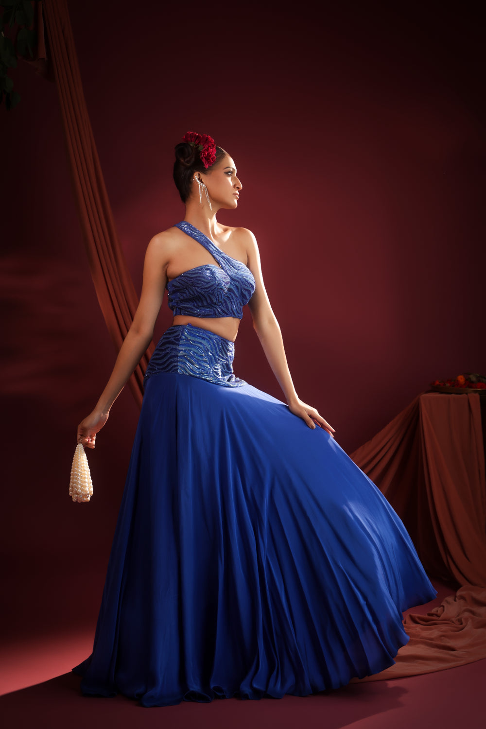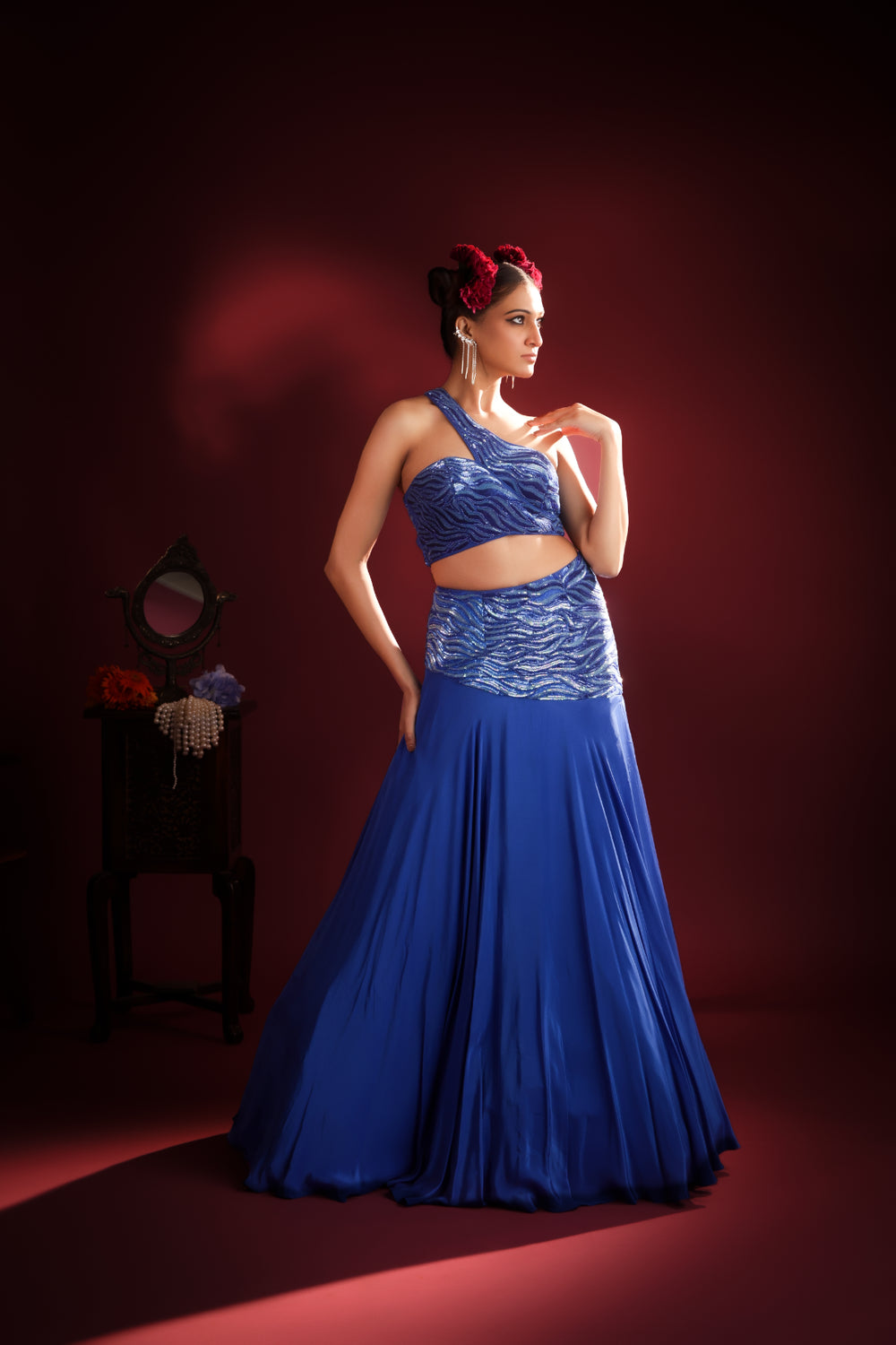 The royal blue silk lehenga swirls with grace, its silver accents shimmering under every light. Paired with a statement one-shoulder blouse, it balances tradition with modern flair, making it an unforgettable choice for glamorous evenings.