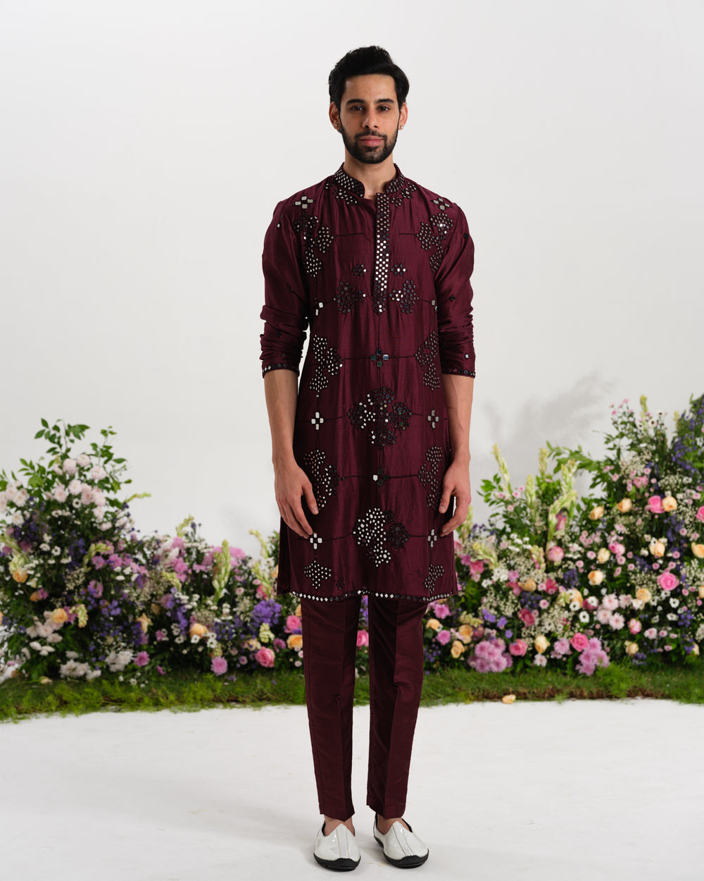 This burgundy Chanderi kurta highlighted with intricate mirrorwork embellishments, crafted in a refined straight silhouette that exudes regal elegance while staying rooted in traditional Indian craftsmanship.