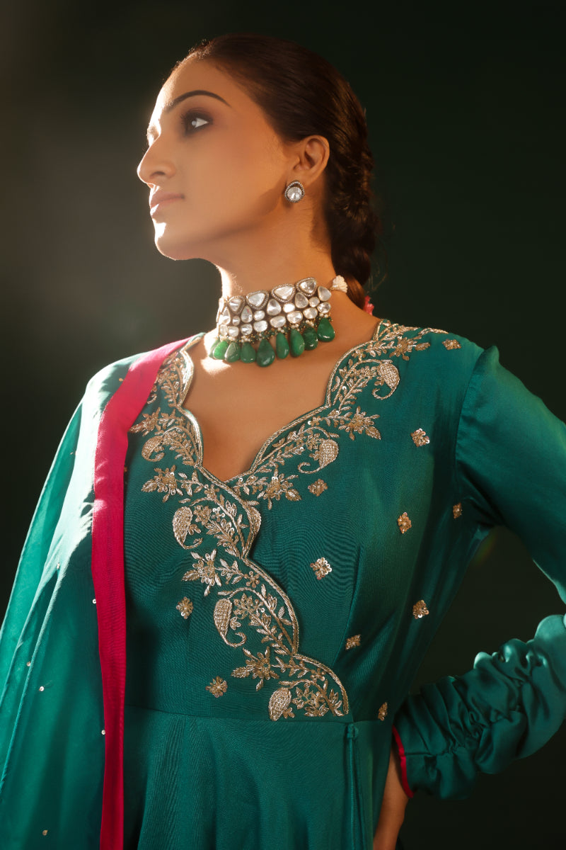 Step into regality with the Emerald Muse Anarkali Set, where timeless craft meets modern sophistication.