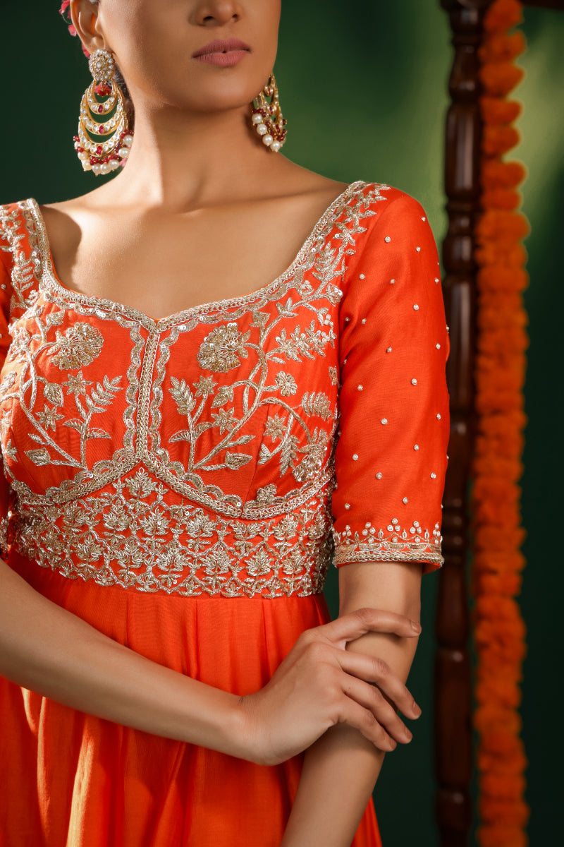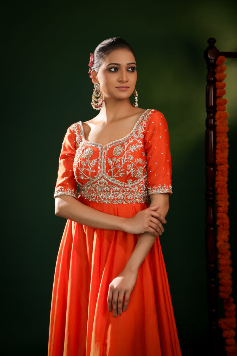 In a radiant Sunset Flame Orange hue, this piece exudes warmth and vibrance, perfect for festive occasions and grand celebrations. The intricately embroidered bodice, adorned with delicate mirror and threadwork, adds a regal touch, while the flowy silk silhouette ensures graceful movement with every twirl. Complete the look with statement earrings and minimal accessories for a breathtaking presence.