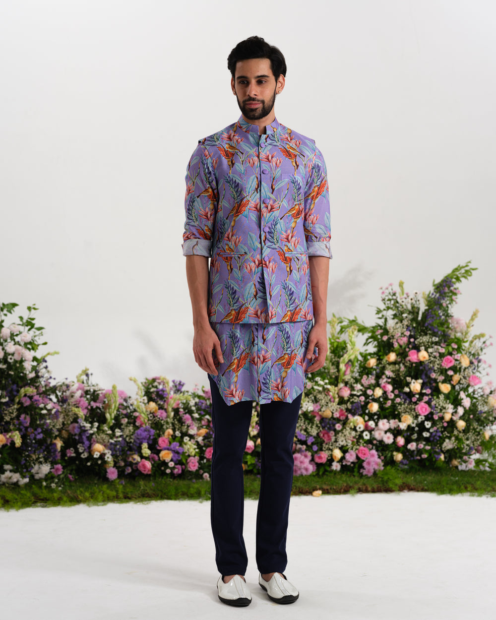 This lavender pure muslin kurta set paired with a coordinating Nehru jacket, featuring refined tropical-inspired prints that bring together contemporary elegance and traditional structure for a polished festive ensemble.