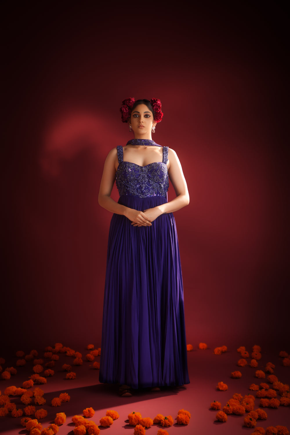 The deep blue silk flows gracefully, creating a look that’s both dramatic and refined. Ideal for evenings where elegance is your statement.