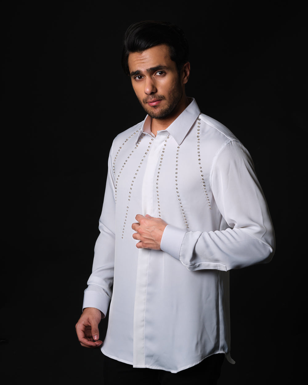 This shirt is crafted in a soft ivory satin-finish fabric that drapes fluidly and reflects light with a subtle sheen. Designed for understated opulence, the White Regent Shirt is elevated with delicate hand-done crystal embroidery cascading from the shoulders down the front -creating a refined statement that feels luxurious yet effortless. Ideal for evenings that call for quiet confidence and polished elegance.