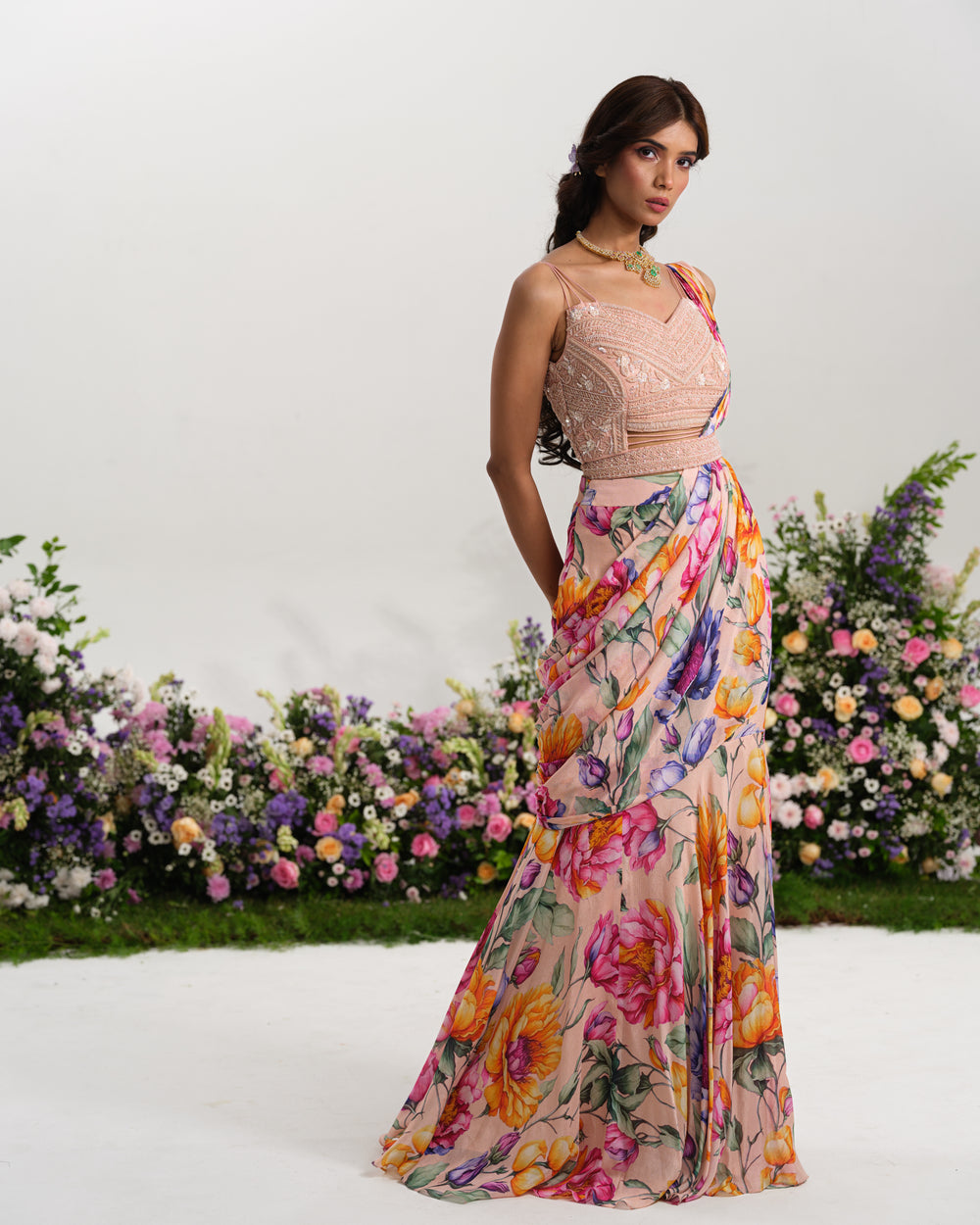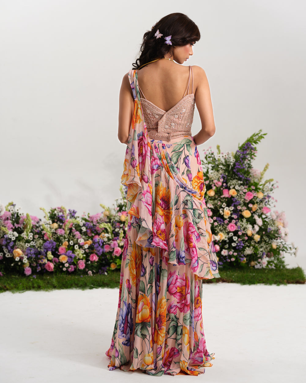 • Fit: Flowing saree with ruffle details for added drama