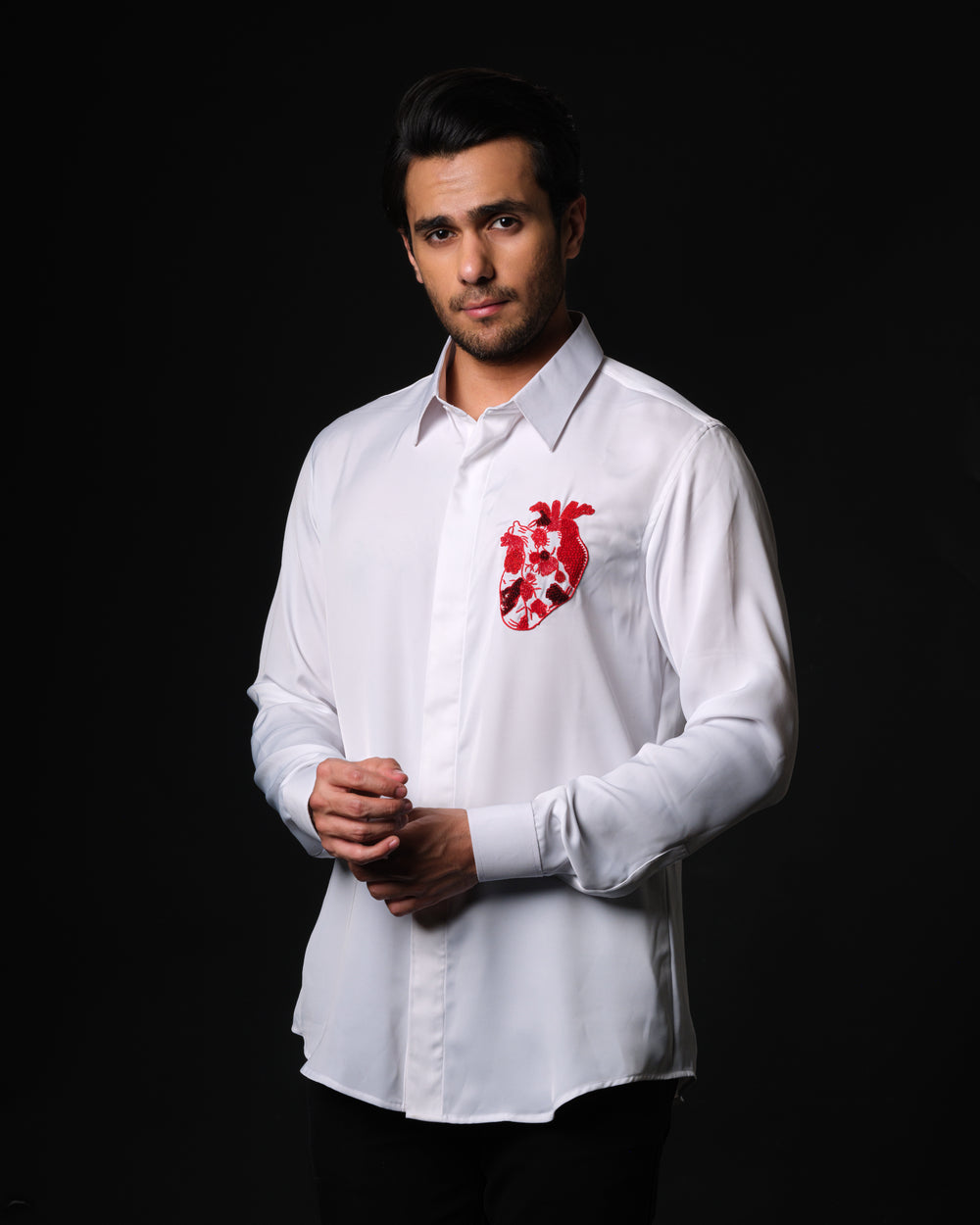This ivory satin-finish shirt features a bold deep-crimson anatomical heart motif, crafted in a clean, fluid silhouette that balances striking expression with refined elegance.