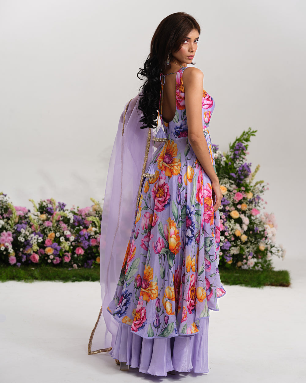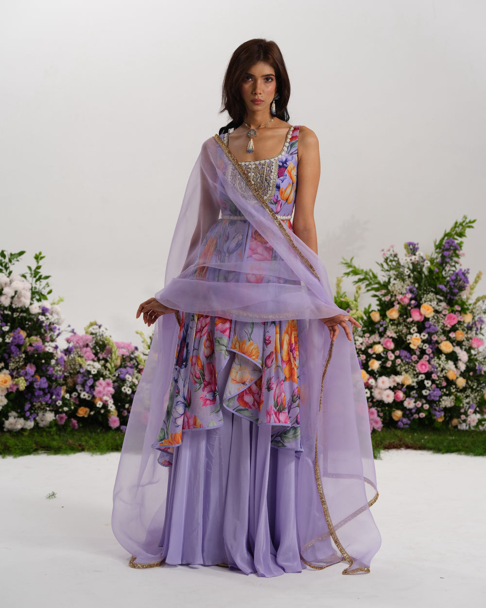 As enchanting as dusk itself, the Twilight Bloom Sharara Set balances boldness and softness. The georgette palazzo pants and chiffon top combine comfort with couture, while the embellished blouse ties the look together with sparkle.